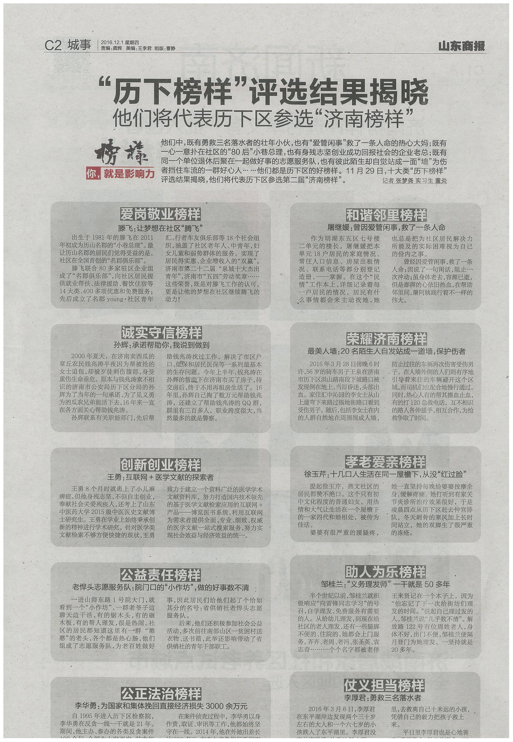 2016年11月29日,十大类“历下榜样”评选结果揭晓,开云手机站登入界面董事长王勇荣获“历下榜样·创新创业榜样”称号,并将代表历下区参选第二届“济南榜样”。
