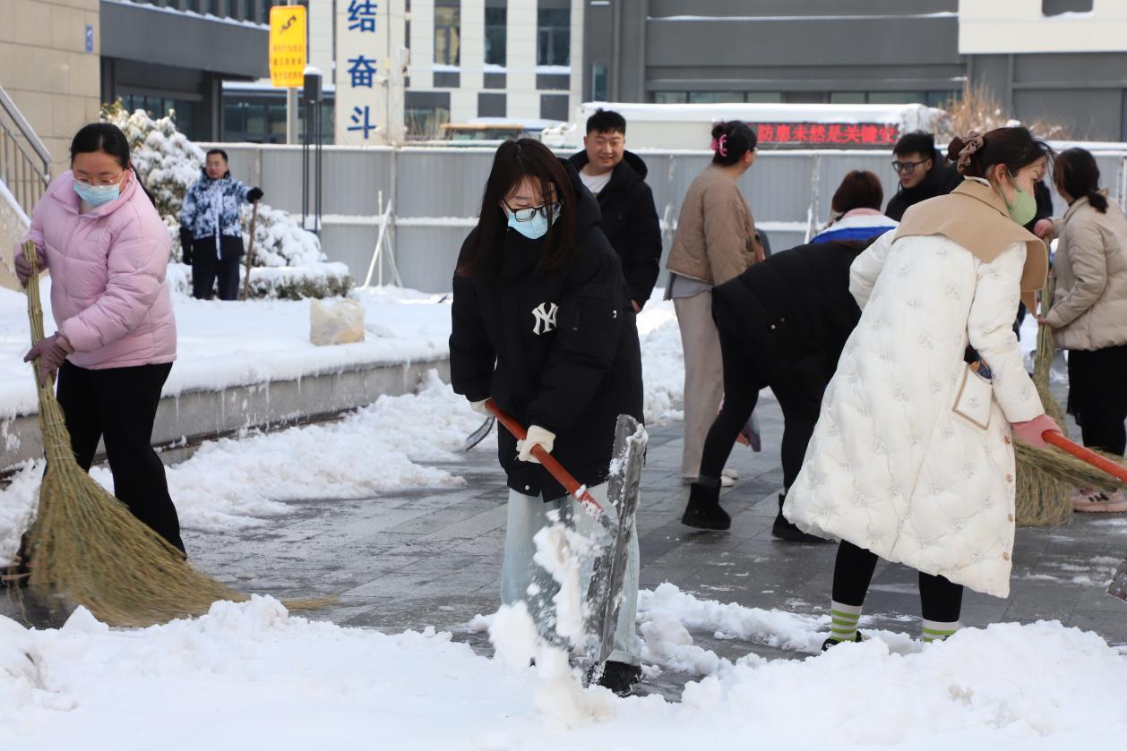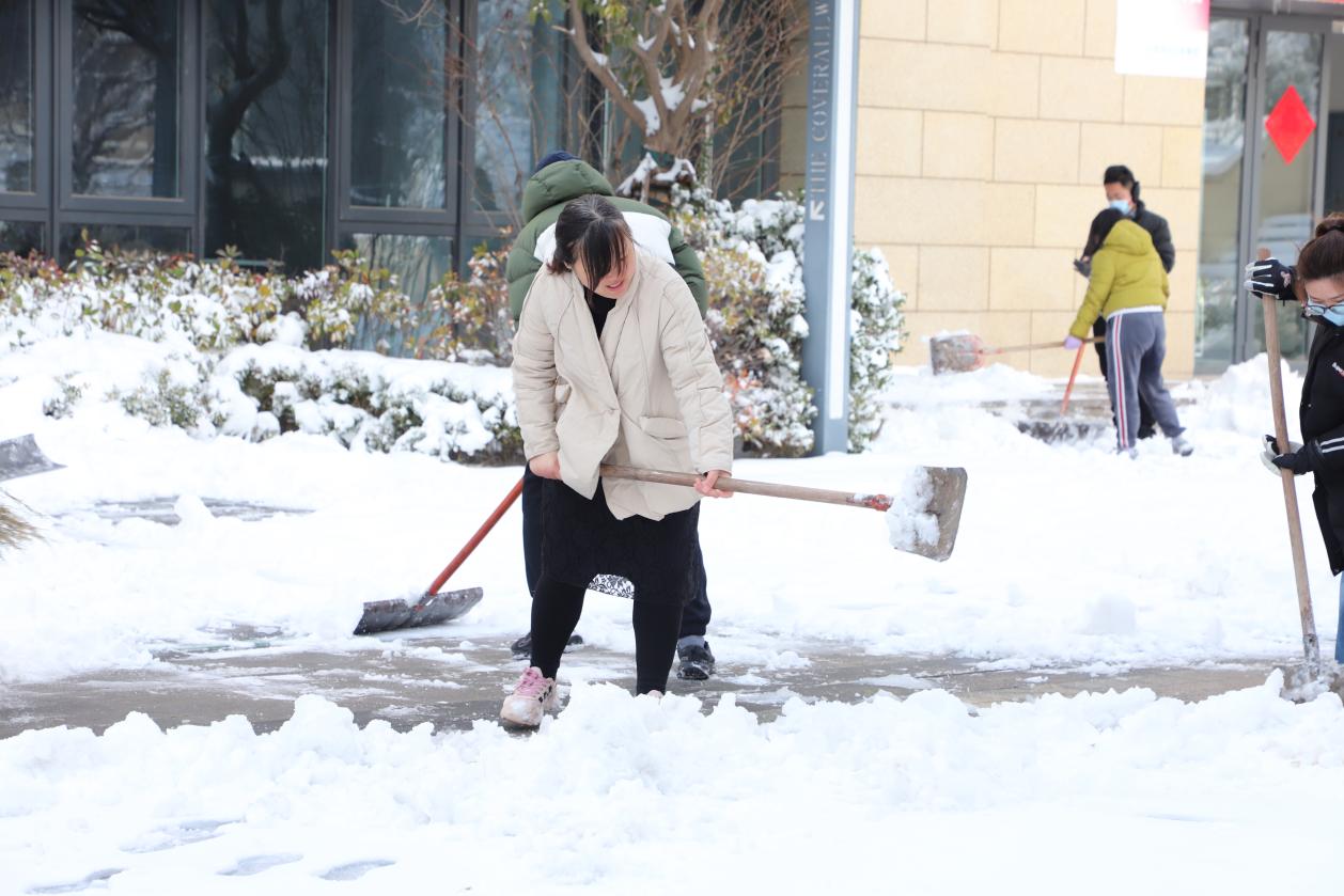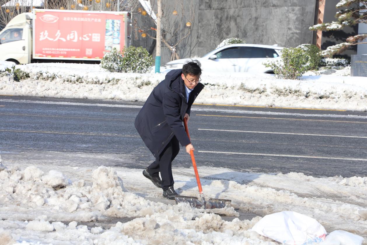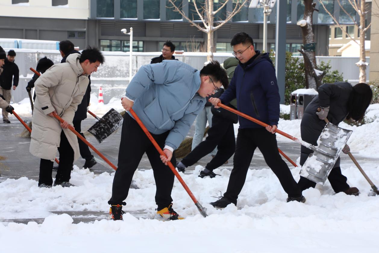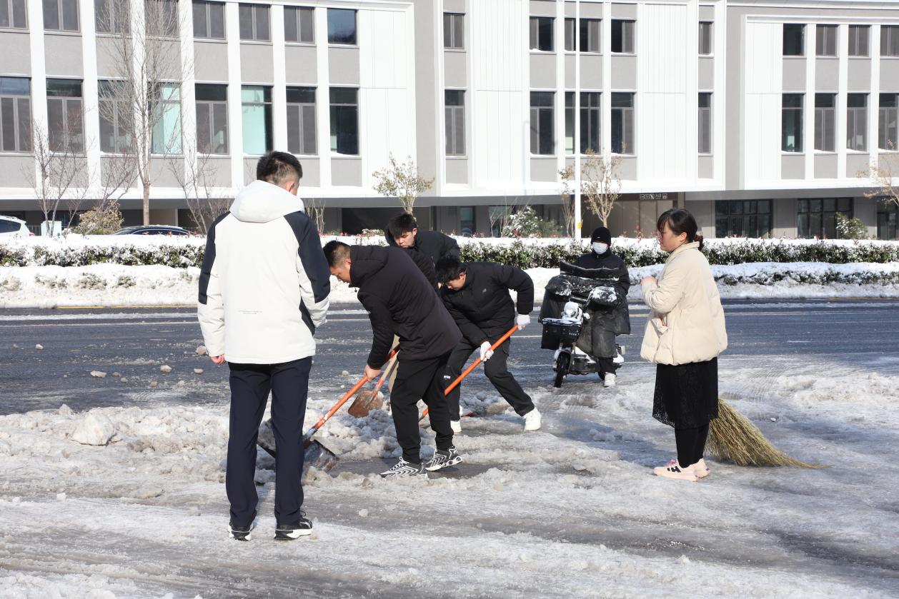大家双手冻得通红,脸上却写满坚定,一心只为尽快打通出行通道,全力保障员工和附近居民出行安全。经过一个多小时的共同努力,及时清除了园区内道路和周边道路的积雪和冰面。