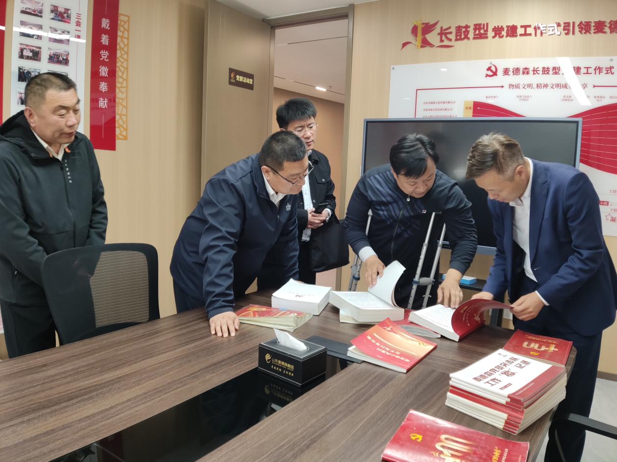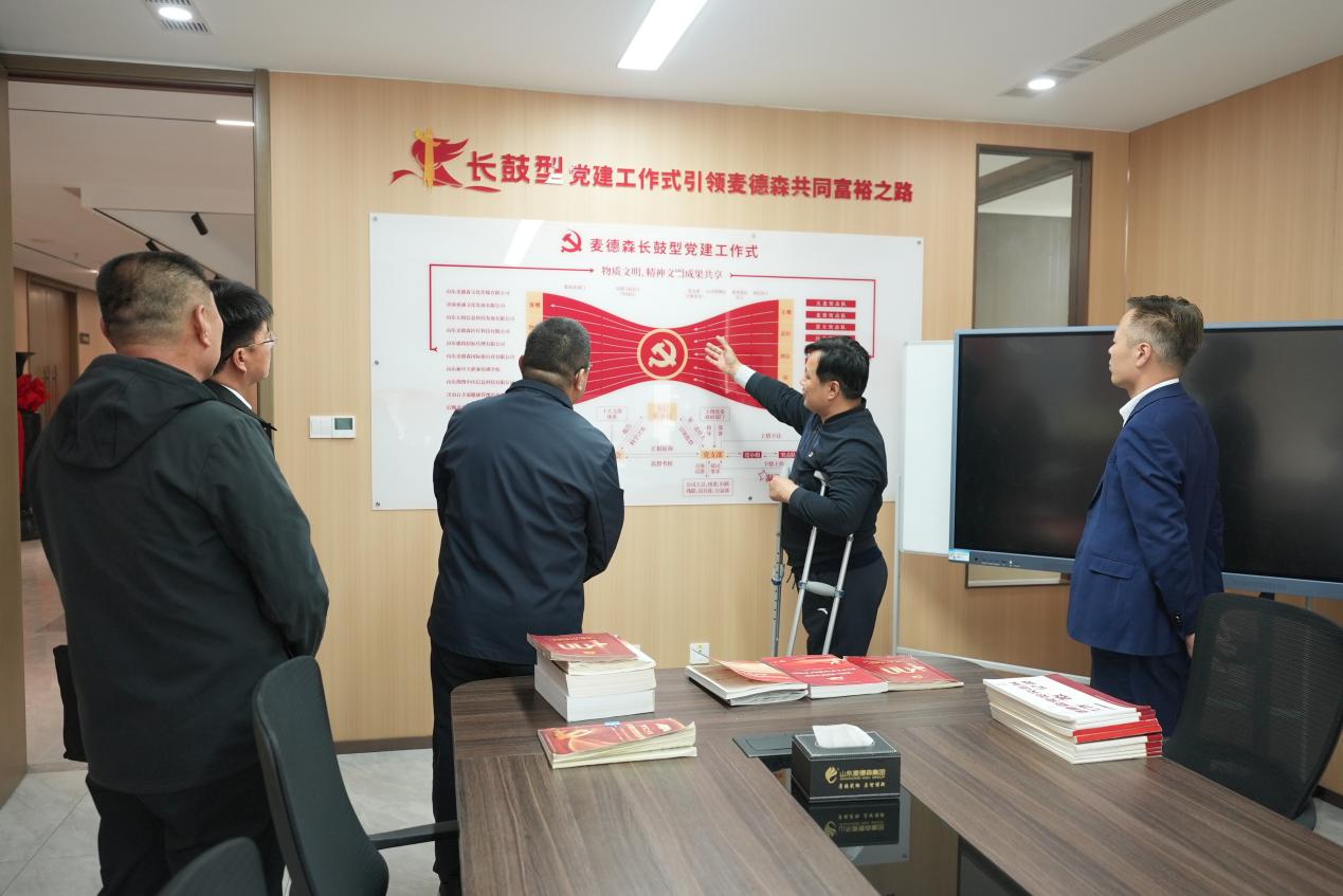 在王勇书记的引导讲解下,德州市平原县领导一行对麦德森党群活动室进行了参观,翻阅查看党员手抄党章、“三会一课”会议记录、“金点子”工程建言献策汇总簿等党建工作材料,听取了麦德森“长鼓型”党建工作式以及“创享工程1.0”改革方案的介绍,深入了解“12345678910——麦德森企业成长发展科学体系”与“1-12345678-91011-1213——麦德森人成长发展科学体系”。