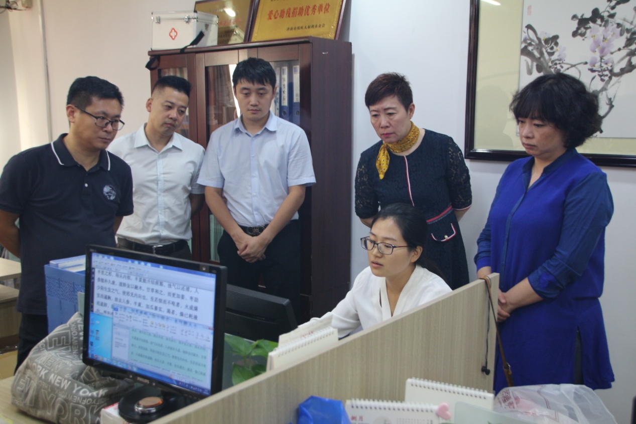 在李校伟的带领下,孙蕾副局长一行先后参观了集团党员活动室、企业文化墙、残疾人文化艺术长廊,以及“博览医书”大数据平台等各业务职能部门办公区域。李校伟向领导们详细介绍了集团发展历程、经营现状以及企业未来发展方向。