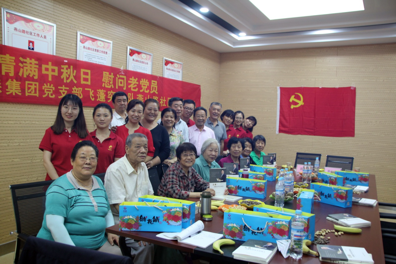 为庆祝祖国七十华诞,继承和弘扬党的优良传统和作风,在中秋佳节来临之际,9月11日下午,我集团党员突击队飞蓬队来到燕山路社区开展“情满中秋日、慰问老党员”联谊活动。燕山路社区党委蒋红梅书记出席活动,集团党支部桑守正副书记、工会张晶华主席携飞蓬突击队部分队员参加活动。