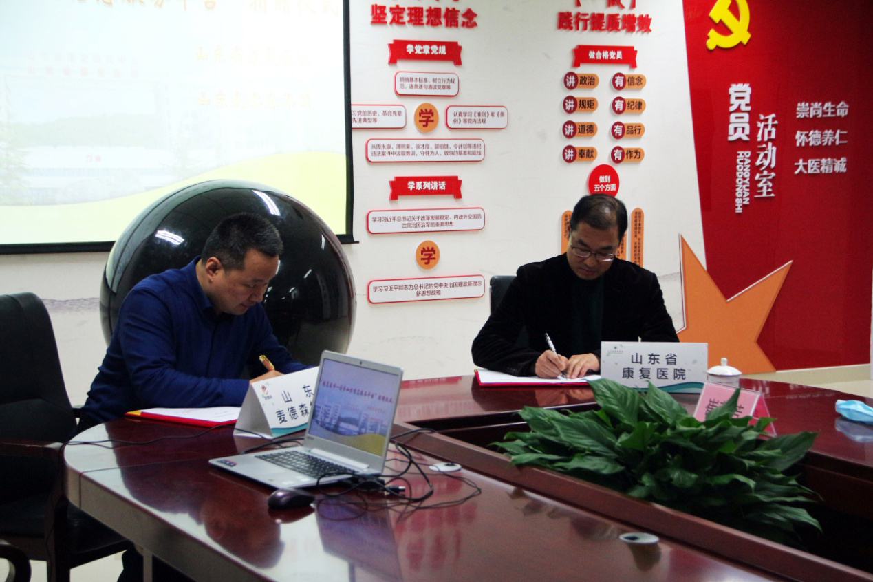 山东省残联副理事长、党组成员黄庆峰,省残联康复部沈晓勇,山东省康复医院院长张斌、副院长王锋等领导出席活动。我集团党支部书记王勇博士出席活动并与山东省康复医院院长张斌现场签署《“博览医书——医学知识信息服务平台”捐赠合作协议》。