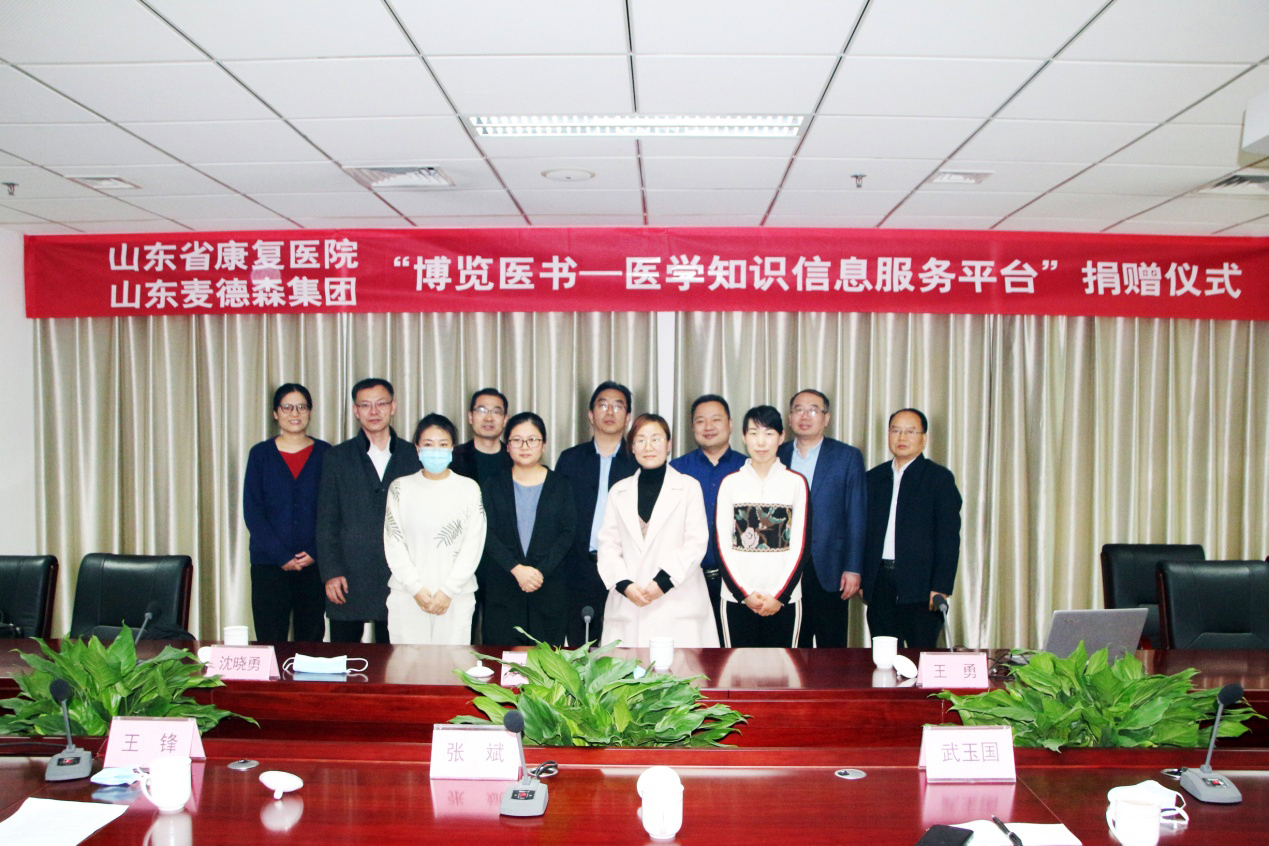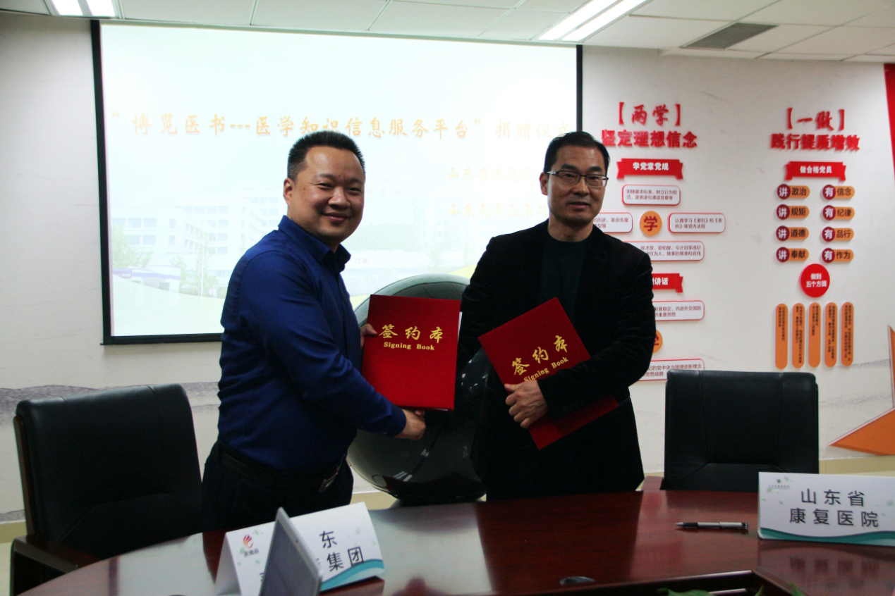 此次捐赠活动,我集团自愿向山东省康复医院捐赠价值壹佰万元“博览医书——医学知识信息服务平台”资源,并提供全库知识检索服务。双方本着合作共赢的原则,就医学知识的生产交流和传播达成战略合作关系。