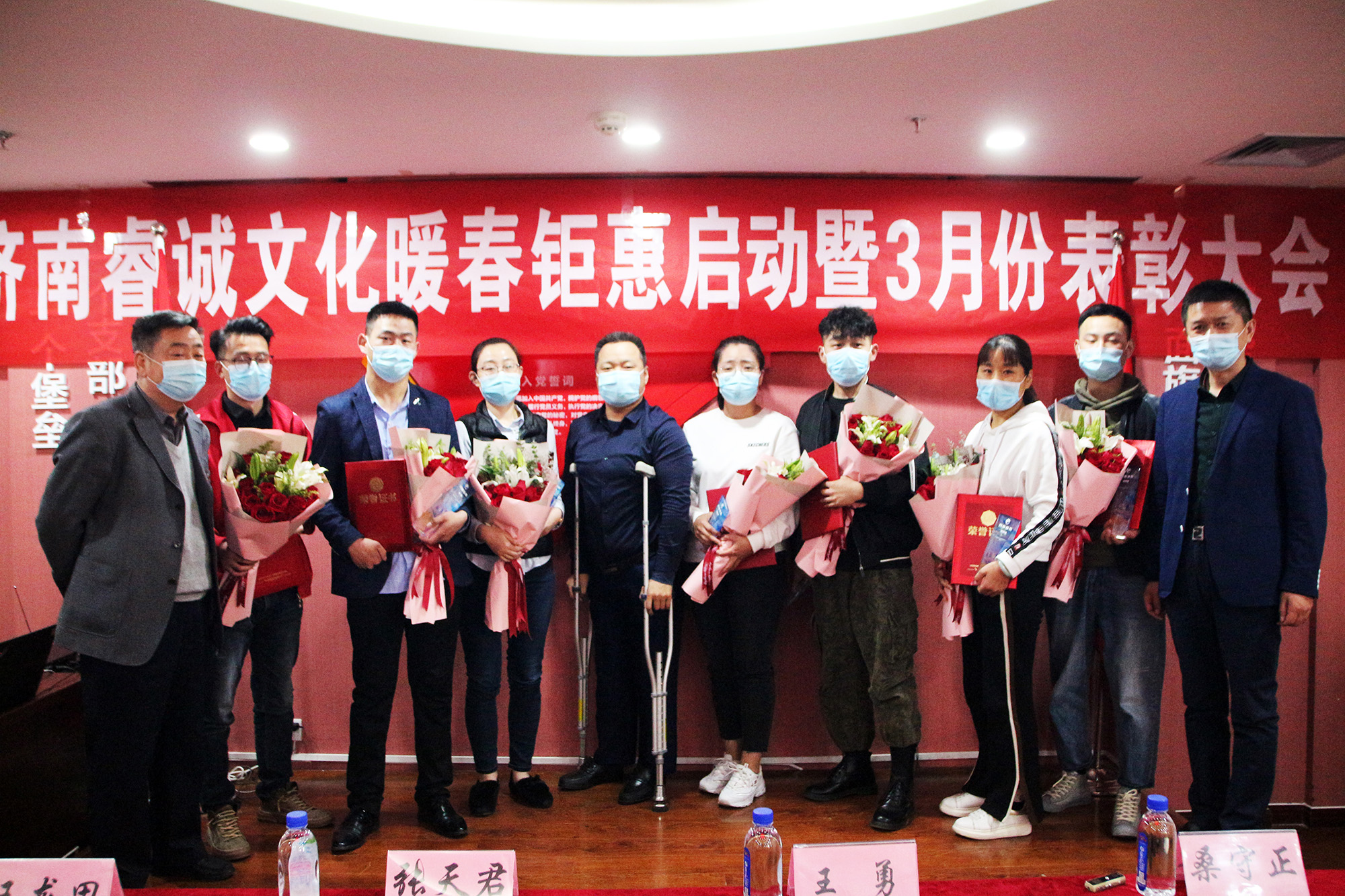阳春三月,花红柳绿,万物复苏,在这个美好的时节, 4月13日,我集团旗下济南睿城文化发展有限公司在党群活动室举行济南睿城文化暖春钜惠启动暨3月份表彰大会。集团党支部书记王勇博士、副书记桑守正、集团总经理张天君等企业领导出席大会。